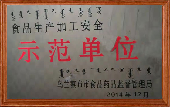 2014年十二月,明明熏雞被烏蘭察布市食藥監(jiān)局授予食品生產(chǎn)加工安全示范單位